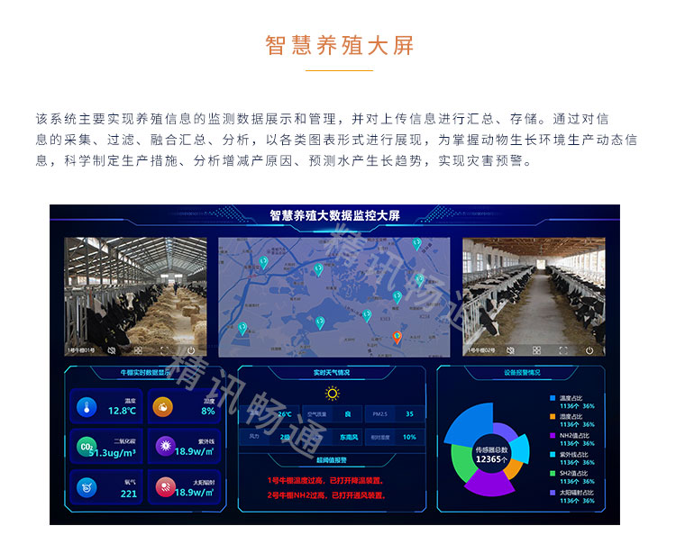 智慧畜牧养殖系统通过智能物联网传感器在线采集养殖场环境信息(二氧化碳、氨气、硫化氢、空气温湿度等),同时集成及改造现有的养殖场环境控制设备,实现畜禽养殖的智能生产与科学管理。